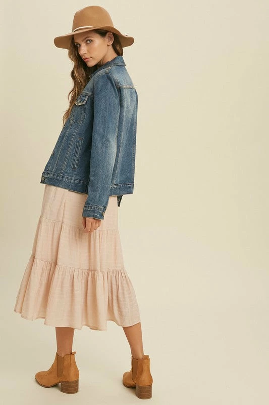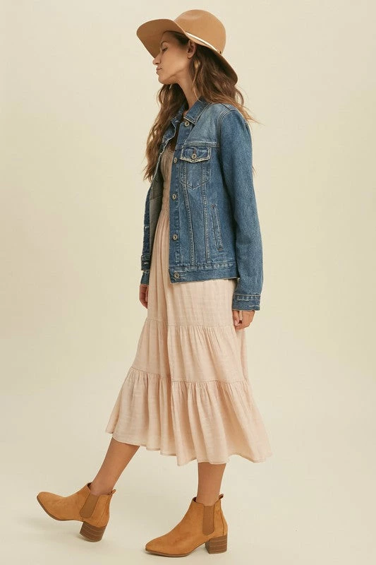 Denim jackets are a MUST and so on trend! This babe has a vintage classic feel, with a semi fitted cut, button front closure, front chest pockets with button closure, button cuffed sleeves, and open side pockets, So cute paired with leggings and band tees, or over dresses. Such a perfect jacket!