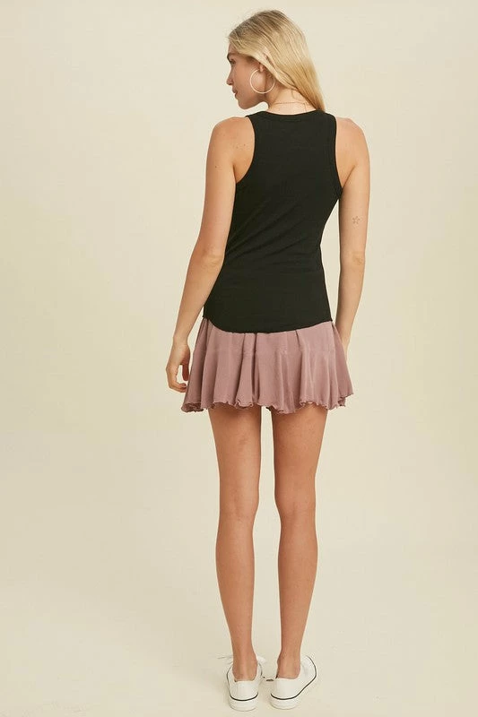 The fitted rib sleeveless top that you need this summer! It’s the ultimate tank for the “bodysuit” look without the actual bodysuit! Features a light rib knit and curved hem.