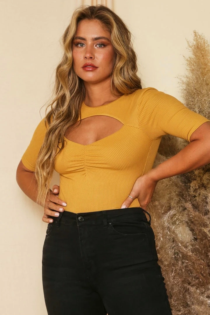 Mustard Ribbed Knit Bodysuit With Cut Out