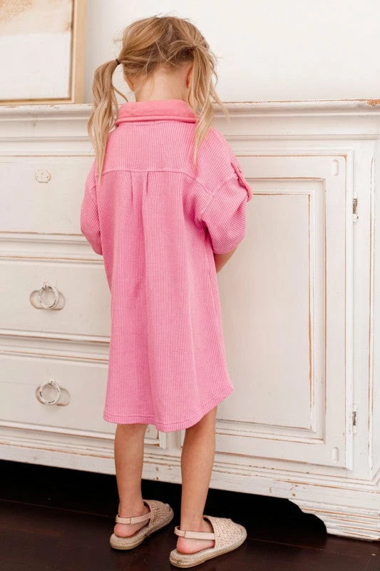 Your little one will love this cute dress! Washed pink knit shift dress featuring button front neckline, double front chest pockets and short sleeves with tab detail. So adorable!Â