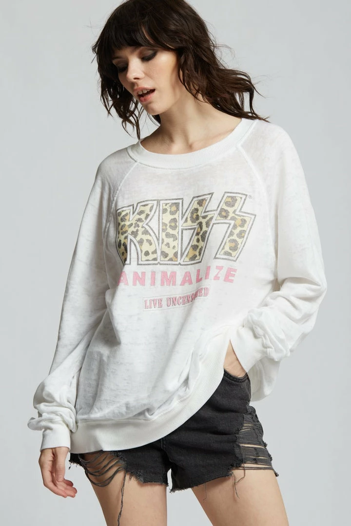 A spotlight on the American rock band KISS and their 1984 Animalize Live Uncensored Tour. Complete with tour dates of KISS tour locations in the USA on back. This classic rock graphic sweatshirt will show off your taste in good rock music as well as style. Made with perfectly oversized soft-washed down fabric with ribbed cuffs and collar.Â