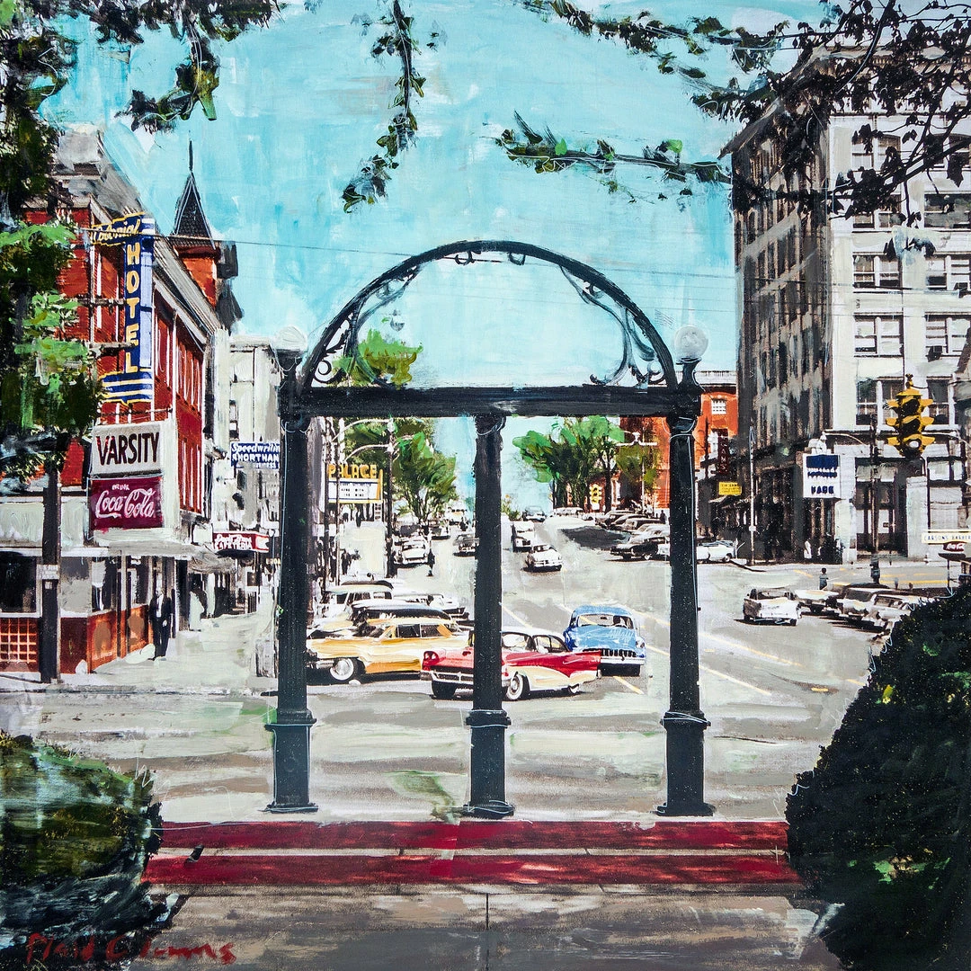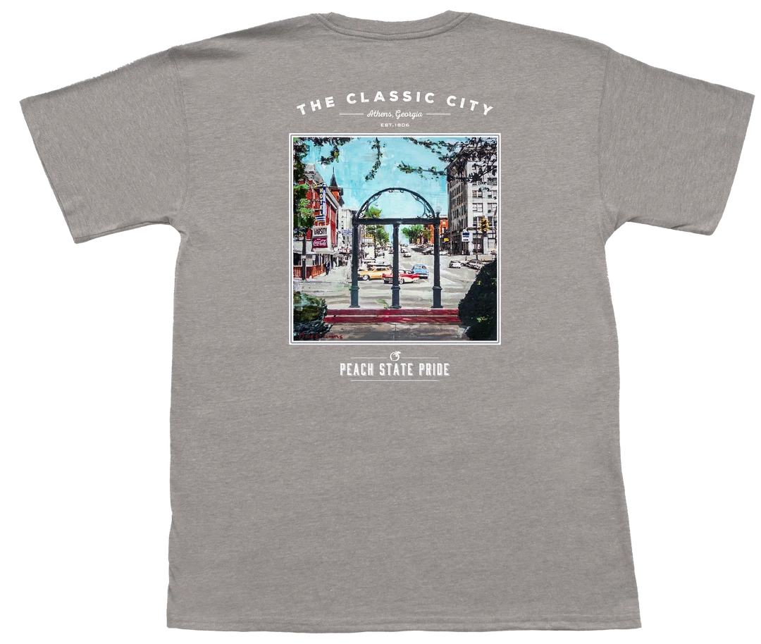 This Peach State Pride cotton short sleeve pocket t-shirt with a classic fit features a vintage Athens scene by Georgia artists, Plaid Columns.
