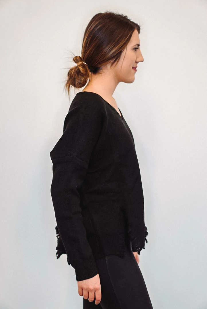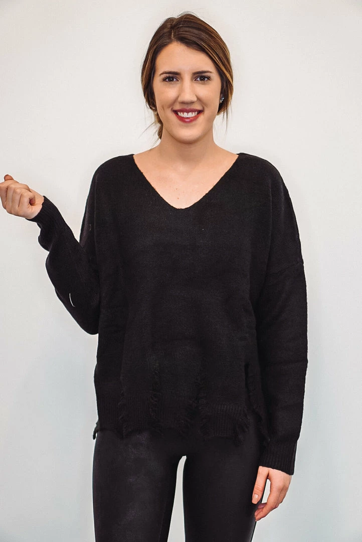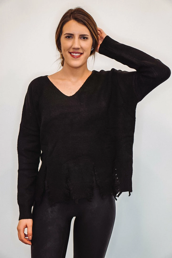 You’re sure to fall in love with this black cozy knit sweater! Featuring a v neckline and rib cuffed long sleeves with deeply distressed bottom hemline. Such a fun and cute sweater for date nights or casual days out, and the fabric is perfect for the upcoming chilly weather. Love this paired with distressed denim and some boots for a perfect fall or winter look! Comes in 3 colors!