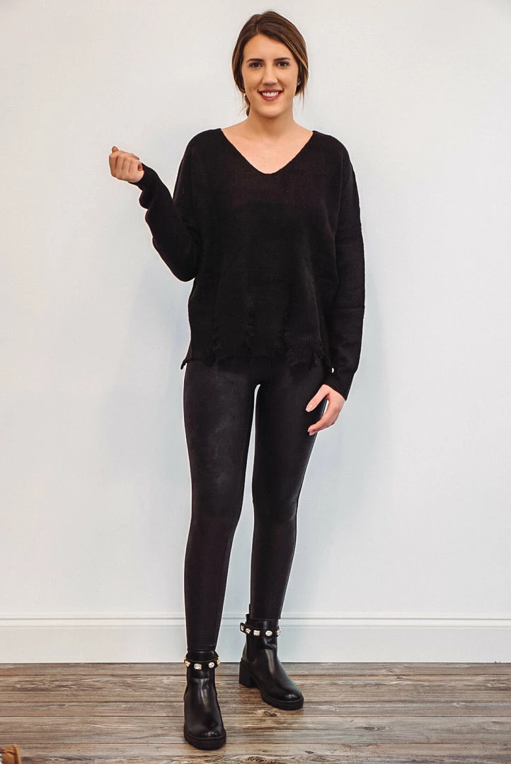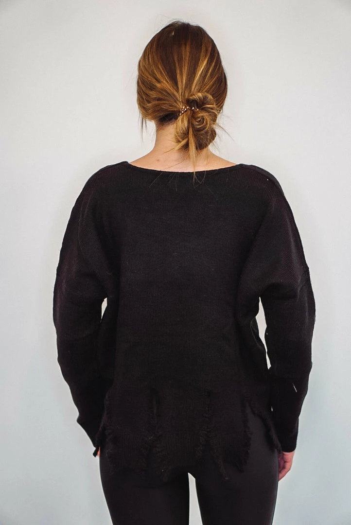 Black knit long sleeve distressed sweater