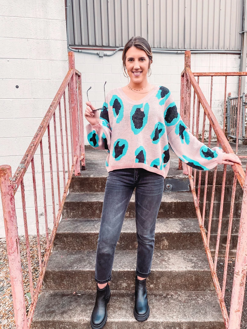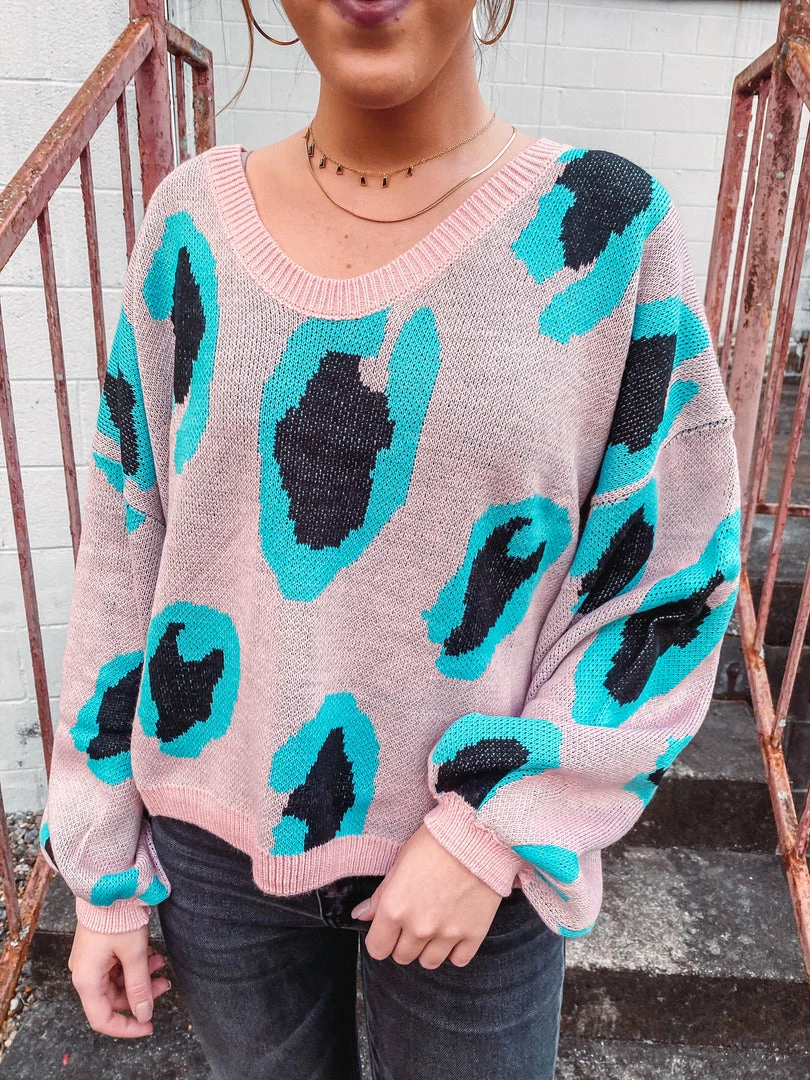 You’re sure to fall in love with this fun retro sweater! Featuring an oversized fit, with aqua and black animal print, crew neckline and long sleeves. This sweater is perfect for date nights or casual days out. The retro look is super fun, and the fabric is perfect for chilly nights. Love this paired with distressed denim and some boots for a perfect fall or winter look!Â