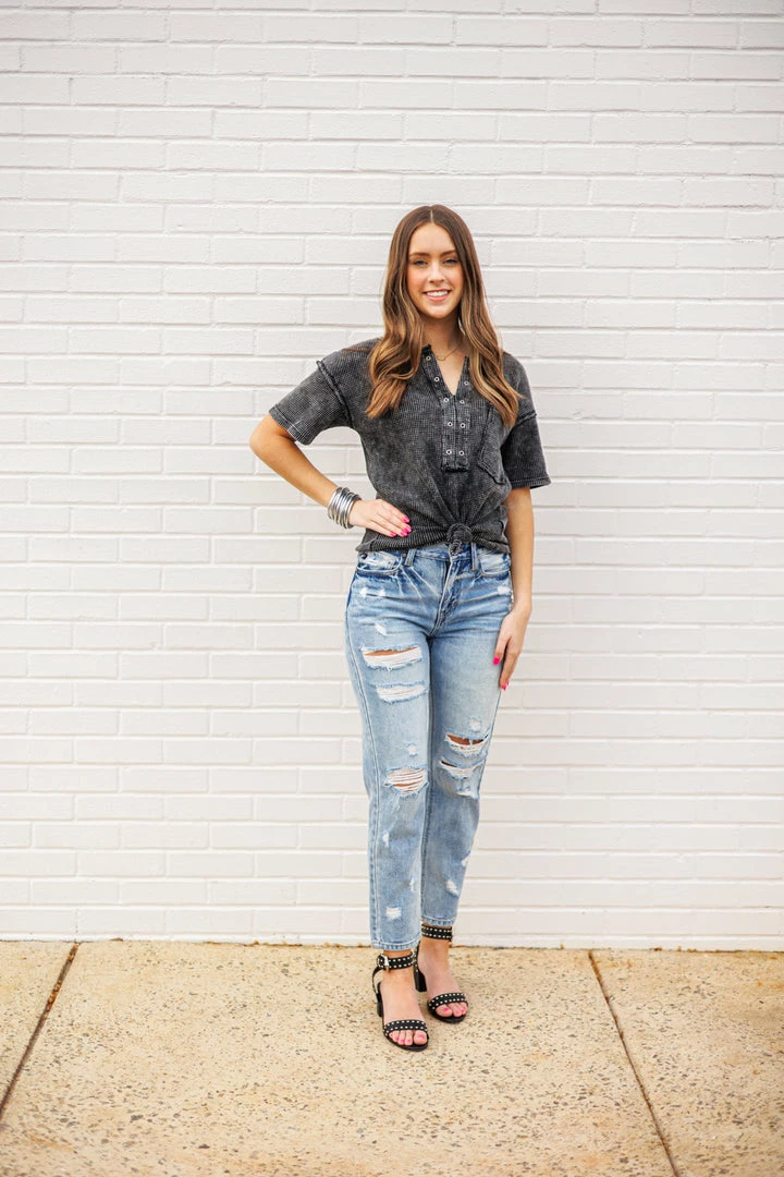 A very trendy twist to your average waffle knit top! This cutie is black charcoal mineral washed, giving it a very vintage appearance. Featuring a v neckline with an eyelet placket, a front chest patch pocket, and raw seam details throughout. So cute by itself, or size up and wear off the shoulder over a cute bralette!
